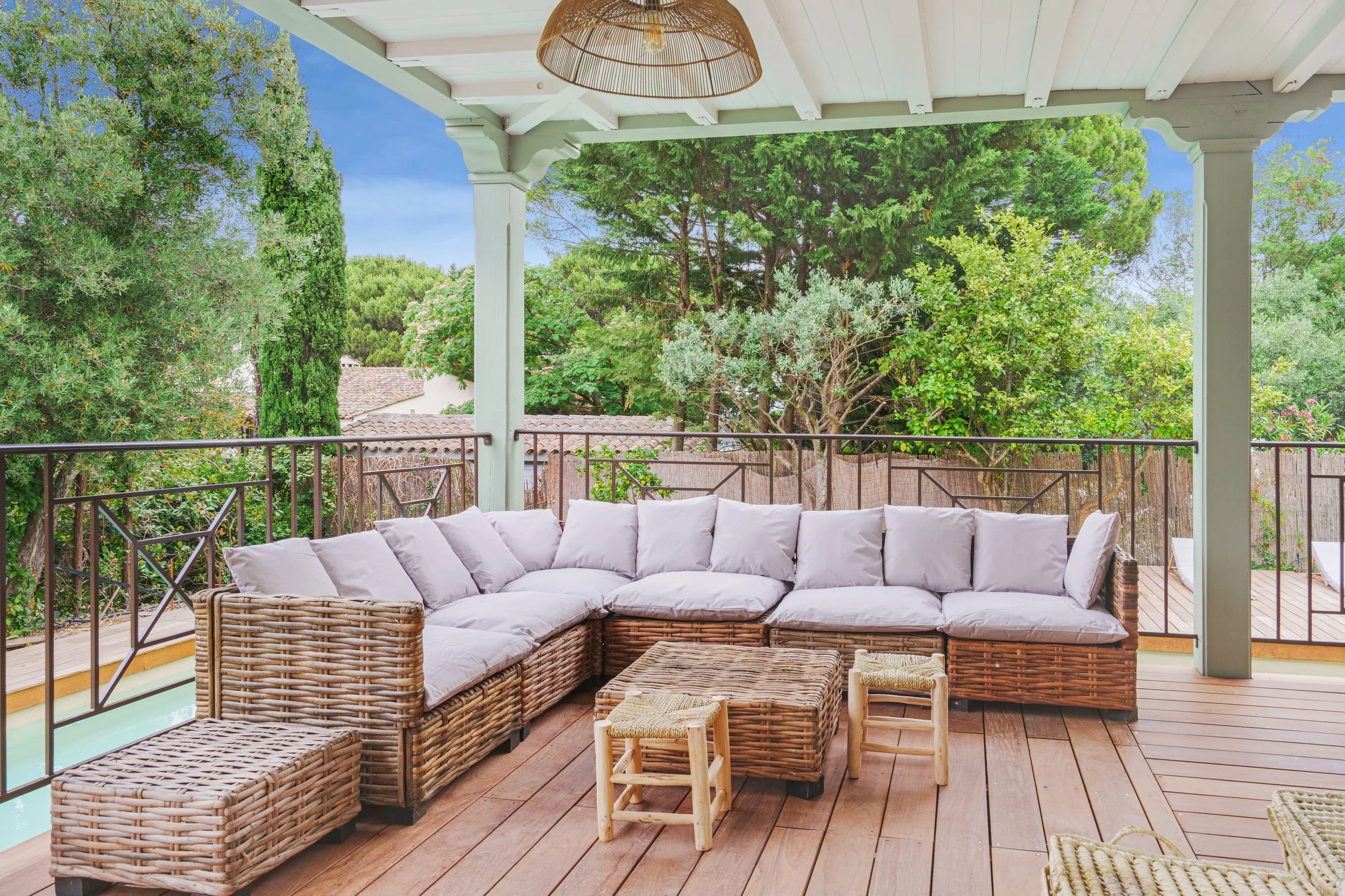 L’intérieur lumineux s’ouvre sur de beaux espaces de vie, à la fois conviviaux et raffinés, tandis que l’extérieur invite à la détente avec ses terrasses aménagées, son jardin paysager et sa piscine entourée de coins ombragés.
